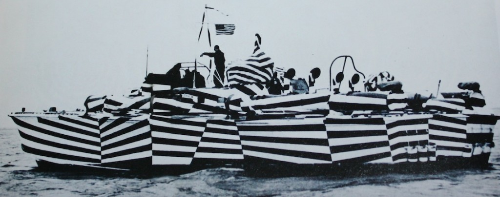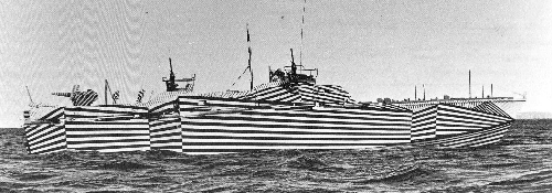 Dazzle camouflage (razzle dazzle) was a family of ship camouflage used extensively in World War I. It consisted of complex patterns of geometric shapes in contrasting colors, interrupting and intersecting each other. The intention is not to conceal but to make it difficult to estimate a target's range, speed, and heading.
